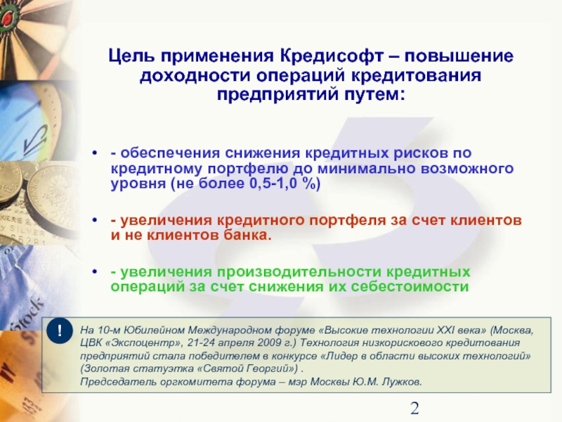 На 10-м Юбилейном Международном форуме «Высокие технологии ХХI века» (Москва, ЦВК «Экспоцентр», 21-24 апреля 2009 г.) Технология низкорискового кредитования предприятий стала победителем в конкурсе «Лидер в области высоких технологий» (Золотая статуэтка «Святой Георгий») .