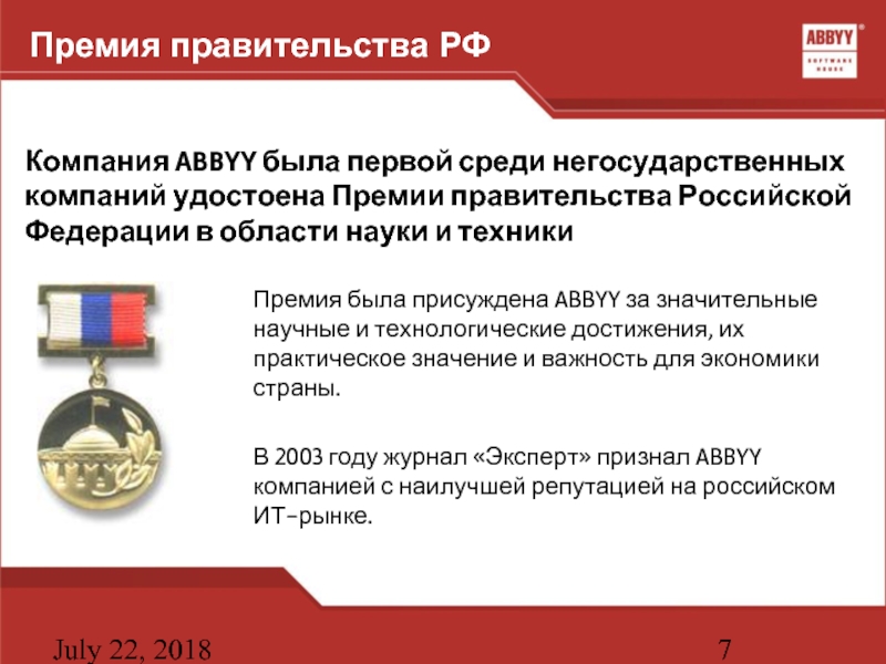Премия была присуждена ABBYY за значительные научные и технологические достижения, их практическое значение и важность для экономики страны.