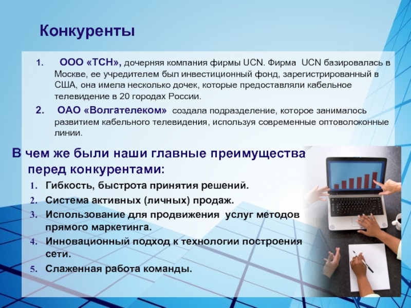 ООО «ТСН», дочерняя компания фирмы UCN. Фирма UCN базировалась в Москве, ее учредителем был инвестиционный фонд, зарегистрированный в США, она имела несколько дочек, которые предоставляли кабельное телевидение в 20 городах России.