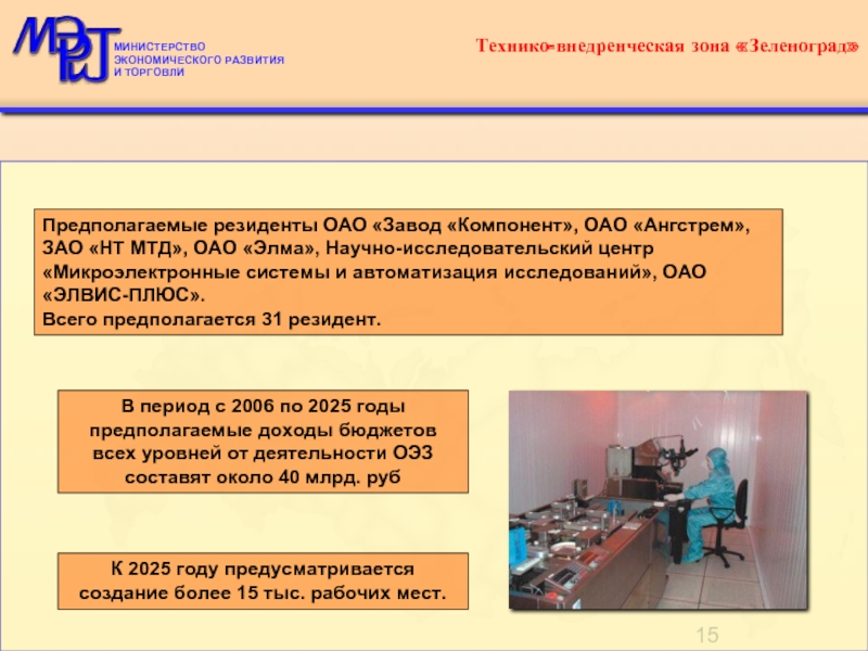 Предполагаемые резиденты ОАО «Завод «Компонент», ОАО «Ангстрем», ЗАО «НТ МТД», ОАО «Элма», Научно-исследовательский центр «Микроэлектронные системы и автоматизация исследований», ОАО «ЭЛВИС-ПЛЮС».