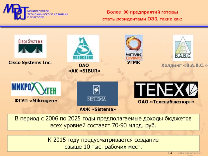 В период с 2006 по 2025 годы предполагаемые доходы бюджетов всех уровней от деятельности ОЭЗ составят около 40 млрд. руб