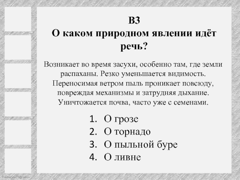 Возникает во время засухи, особенно там, где земли распаханы. Резко уменьшается видимость. Переносимая ветром пыль проникает повсюду, повреждая механизмы и затрудняя дыхание. Уничтожается почва, часто уже с семенами.
