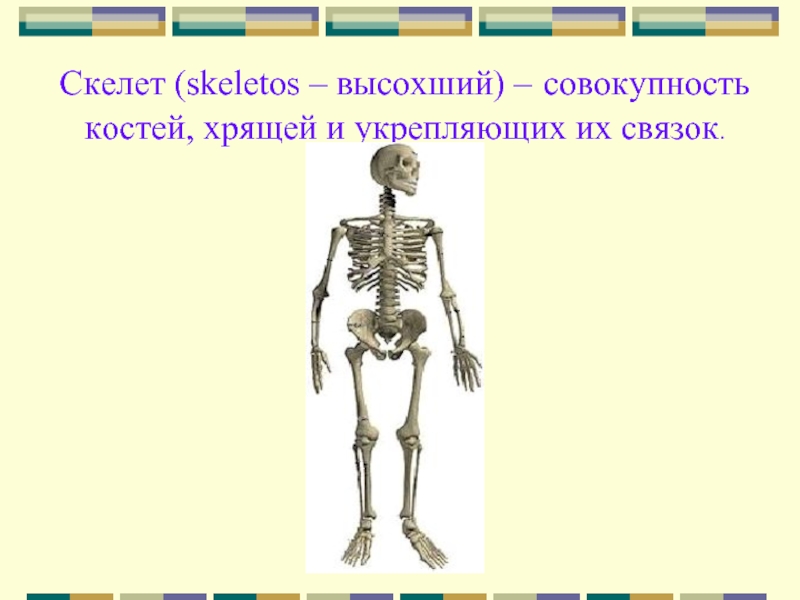 Слайд 5Скелет (skeletos – высохший) – совокупность костей, хрящей и укрепляющих их