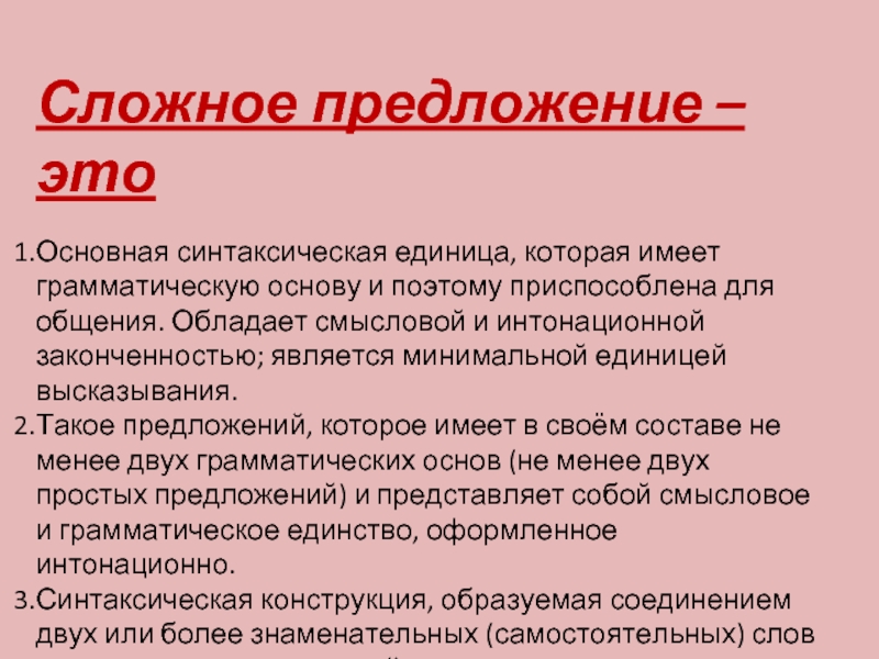 Такое предложений, которое имеет в своём составе не менее двух грамматических основ (не менее двух простых предложений) и представляет собой смысловое и грамматическое единство, оформленное интонационно.