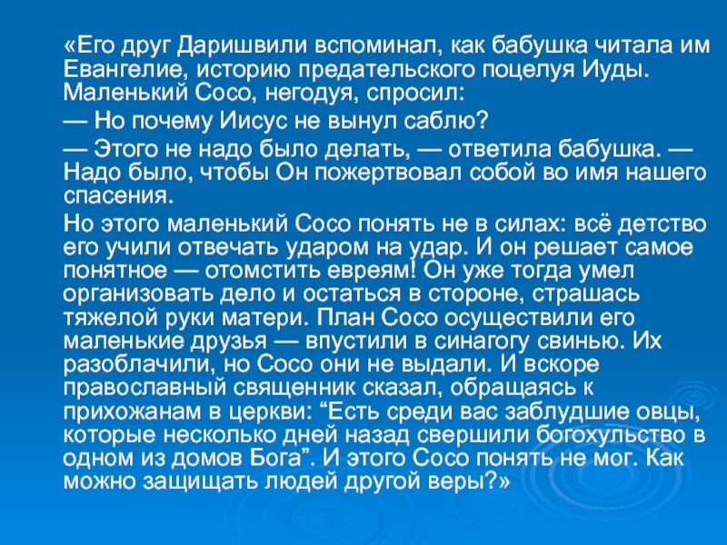 Слайд 19«Его друг Даришвили вспоминал, как бабушка читала им Евангелие, историю предательского