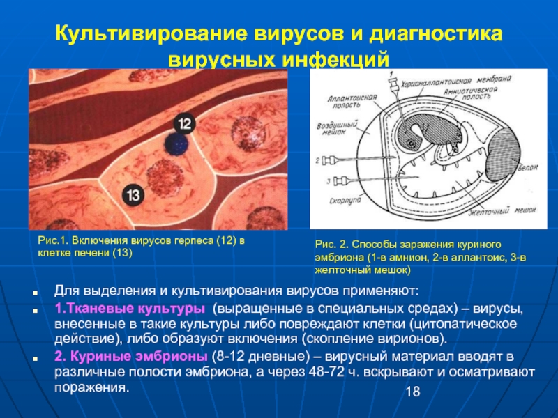Рис.1.Вирус герпеса (мелки бляшки) в клетках оболочки зародыша .       Рис.2. Адсорбция эритроцитов на поверхности зараженной вирусом клетке.