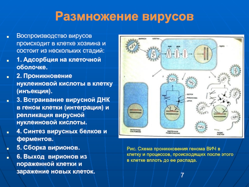 Рис. Схема проникновения генома ВИЧ в клетку и процессов, происходящих после этого в клетке вплоть до ее распада.