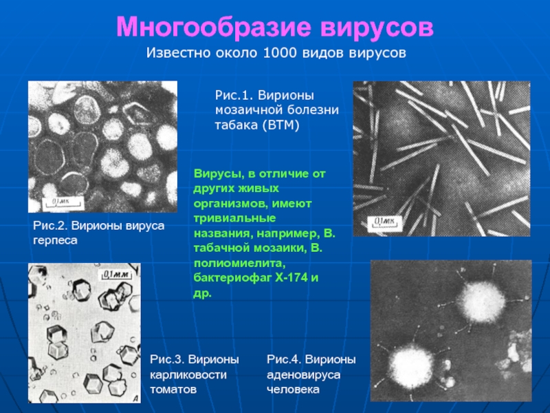 Вирусы, в отличие от других живых организмов, имеют тривиальные названия, например, В. табачной мозаики, В. полиомиелита, бактериофаг Х-174 и др.
