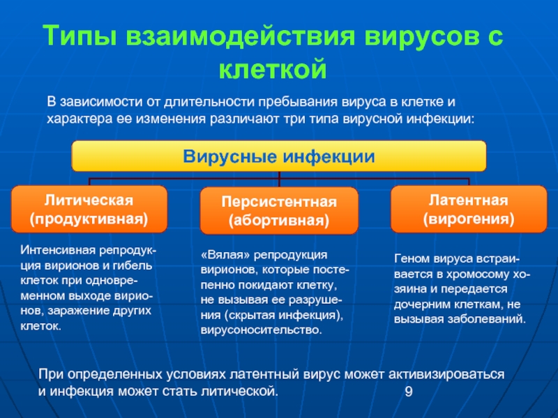 В зависимости от длительности пребывания вируса в клетке и характера ее изменения различают три типа вирусной инфекции: