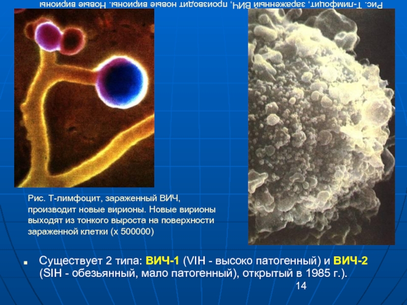 Существует 2 типа: ВИЧ-1 (VIH - высоко патогенный) и ВИЧ-2 (SIH - обезьянный, мало патогенный), открытый в 1985 г.).