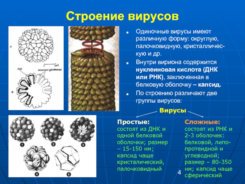 Простые: состоят из ДНК и одной белковой оболочки; размер – 15-150 нм; капсид чаще кристалический, палочковидный