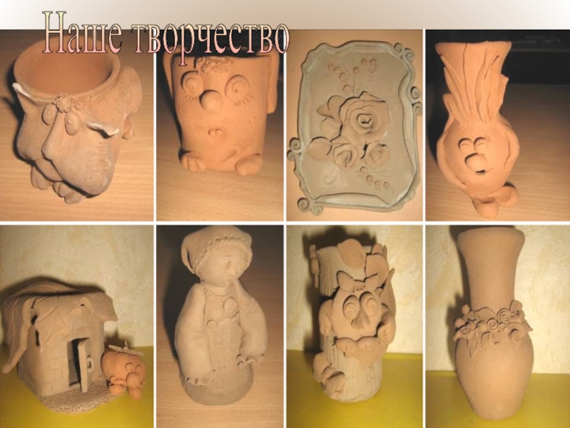 УДИВИТЕЛЬНОЕ ЭТО ЗАНЯТИЕ ЛЕПКА ИЗ ГЛИНЫ. ИЗ КУСКА ОБЫЧНОЙ ГЛИНЫ МОЖНО СДЕЛАТЬ ЧТО УГОДНО: СУВЕНИРЫ, СКУЛЬПТУРЫ, ШКАТУЛКИ, КАРАНДАШНИЦЫ, ПОДСВЕЧНИКИ, ВАЗЫ, ПАННО, КРУЖКИ, ДЕКОРАТИВНЫЕ ТАРЕЛКИ, БУСЫ, КУЛОНЫ И ДАЖЕ ПУГОВИЦЫ. И ЧУДЕСА ЗДЕСЬ НИ ПРИ ЧЕМ, НЕОБХОДИМО ТОЛЬКО ЖЕЛАНИЕ, СТАРАНИЕ, ТЕРПЕНИЕ, ЗНАНИЯ И ФАНТАЗИЯ. А ФАНТАЗИЯ У РЕБЯТ, ЗАНИМАЮЩИХСЯ В ОБЪЕДИНЕНИИ, ОЧЕНЬ БОГАТАЯ ОБ ЭТОМ ГОВОРЯТ РЕЗУЛЬТАТЫ ИХ ТВОРЧЕСТВА: