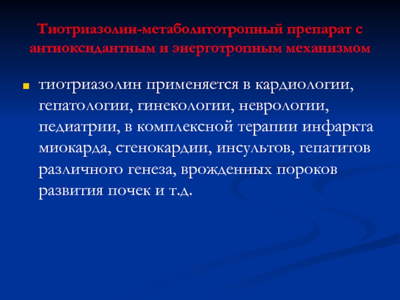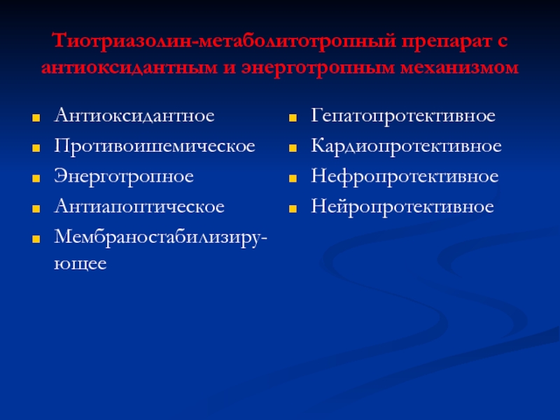 Слайд 4Тиотриазолин-метаболитотропный препарат с антиоксидантным и энерготропным механизмом