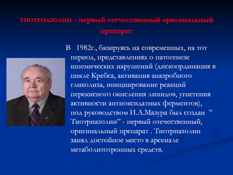современных, на тот период, представлениях о патогенезе ишемических нарушений (дискоординация в цикле Кребса, активация анаэробного гликолиза, инициирование реакций перекисного окисления липидов, угнетения активности антиоксидатных ферментов), под руководством И.А.Мазура был создан ”Тиотриазолин” - первый отечественный, оригинальный препарат . Тиотриазолин занял достойное место в арсенале метаболитотропных средств.