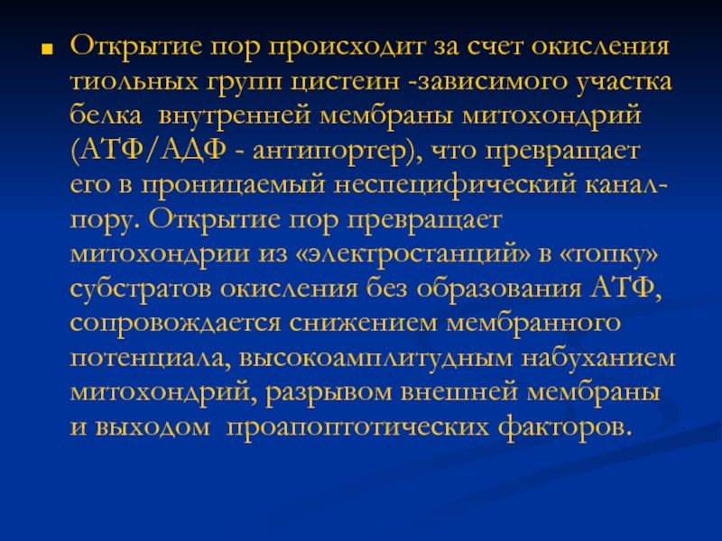 белка внутренней мембраны митохондрий (АТФ/АДФ - антипортер), что превращает его в проницаемый неспецифический канал- пору. Открытие пор превращает митохондрии из «электростанций» в «топку» субстратов окисления без образования АТФ, сопровождается снижением мембранного потенциала, высокоамплитудным набуханием митохондрий, разрывом внешней мембраны и выходом проапоптотических факторов.