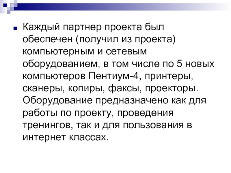 Слайд 11Каждый партнер проекта был обеспечен (получил из проекта) компьютерным и сетевым