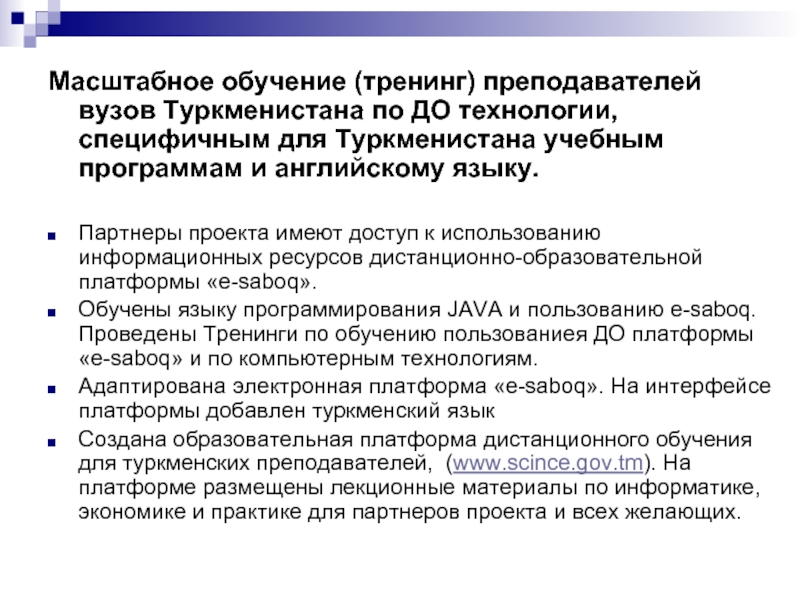 Создана образовательная платформа дистанционного обучения для туркменских преподавателей, (www.scince.gov.tm). На платформе размещены лекционные материалы по информатике, экономике и практике для партнеров проекта и всех желающих.