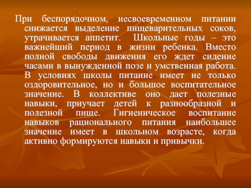 При беспорядочном, несвоевременном питании снижается выделение пищеварительных соков, утрачивается аппетит. Школьные