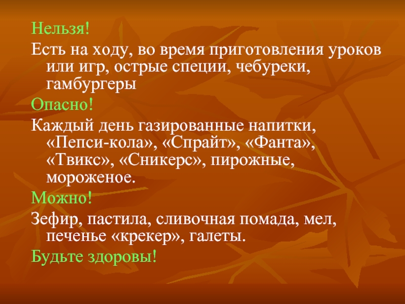 Каждый день газированные напитки, «Пепси-кола», «Спрайт», «Фанта», «Твикс», «Сникерс», пирожные, мороженое.