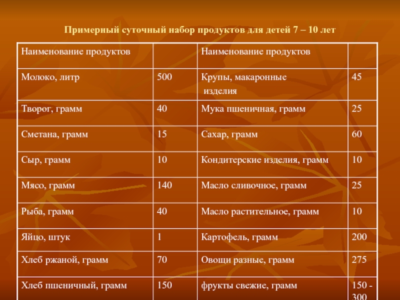 Слайд 7Примерный суточный набор продуктов для детей 7 – 10 лет