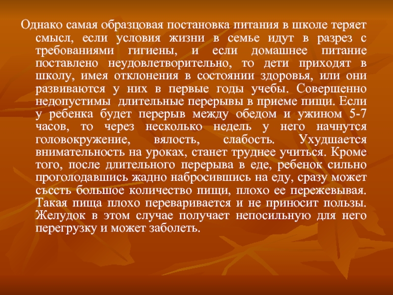 жизни в семье идут в разрез с требованиями гигиены, и если домашнее питание поставлено неудовлетворительно, то дети приходят в школу, имея отклонения в состоянии здоровья, или они развиваются у них в первые годы учебы. Совершенно недопустимы длительные перерывы в приеме пищи. Если у ребенка будет перерыв между обедом и ужином 5-7 часов, то через несколько недель у него начнутся головокружение, вялость, слабость. Ухудшается внимательность на уроках, станет труднее учиться. Кроме того, после длительного перерыва в еде, ребенок сильно проголодавшись жадно набросившись на еду, сразу может съссть большое количество пищи, плохо ее пережевывая. Такая пища плохо переваривается и не приносит пользы. Желудок в этом случае получает непосильную для него перегрузку и может заболеть.
