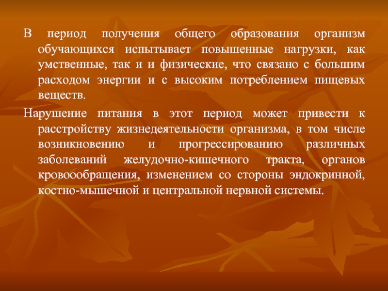 В период получения общего образования организм обучающихся испытывает повышенные нагрузки, как