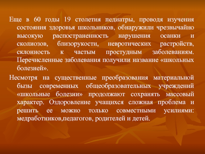 Несмотря на существенные преобразования материальной бызы современных общеобразовательных учреждений «школьные болезни» продолжают сохранять массовый характер. Оздоровление учащихся сложная проблема и решить ее можно только совместными усилиями: медработников,педагогов, родителей и детей.