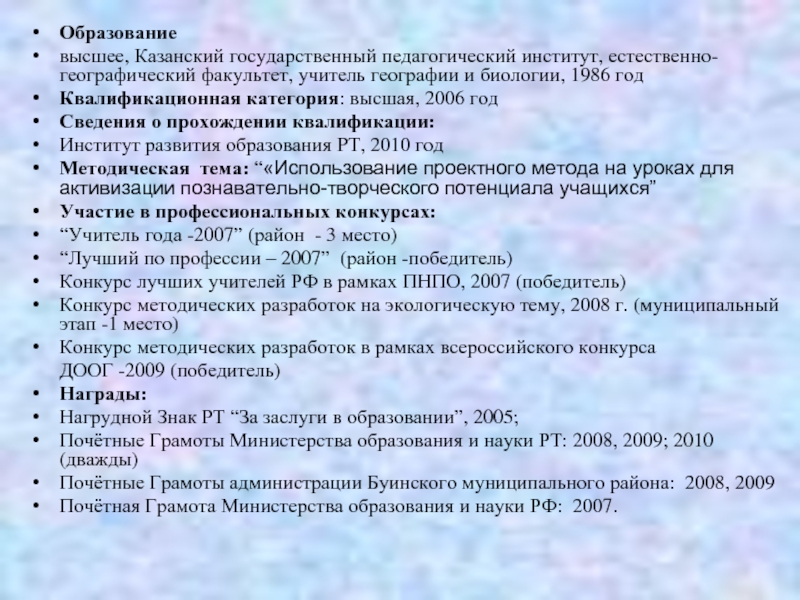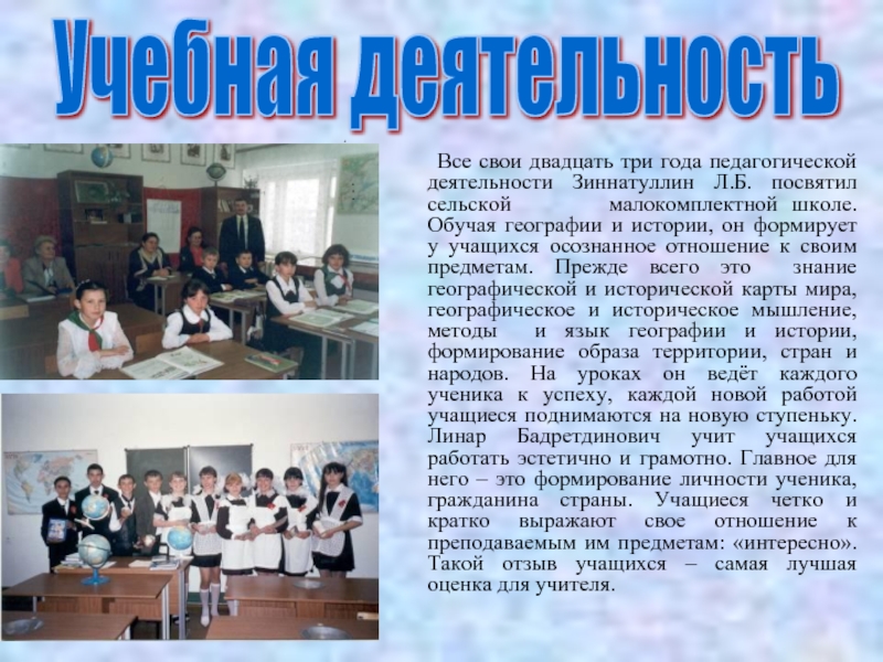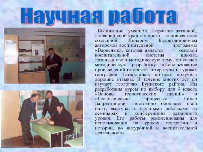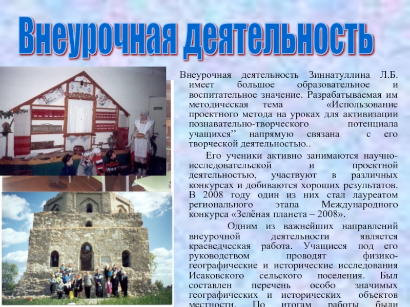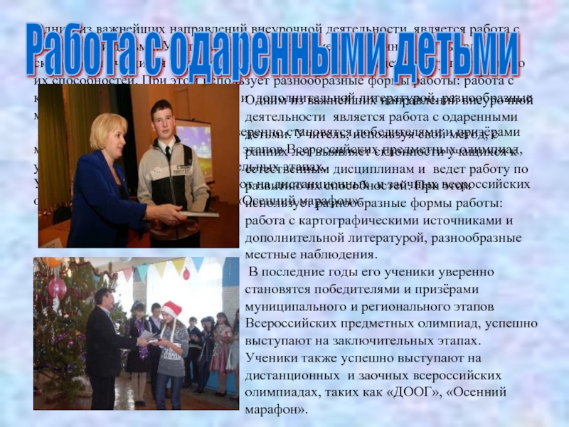 Одним из важнейших направлений внеурочной деятельности является работа с одаренными детьми. Учитель, используя свой метод, с ранних лет выявляет склонности учащихся к естественным дисциплинам и ведет работу по развитию их способностей. При этом использует разнообразные формы работы: работа с картографическими источниками и дополнительной литературой, разнообразные местные наблюдения.