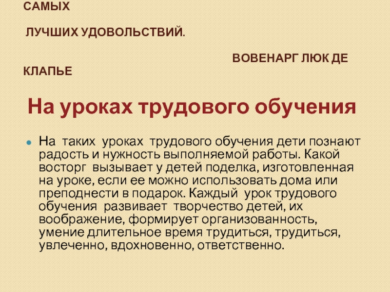 На таких уроках трудового обучения дети познают радость и нужность выполняемой работы. Какой восторг вызывает у детей поделка, изготовленная на уроке, если ее можно использовать дома или преподнести в подарок. Каждый урок трудового обучения развивает творчество детей, их воображение, формирует организованность, умение длительное время трудиться, трудиться, увлеченно, вдохновенно, ответственно.