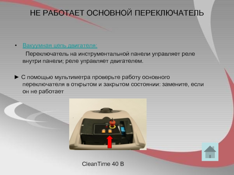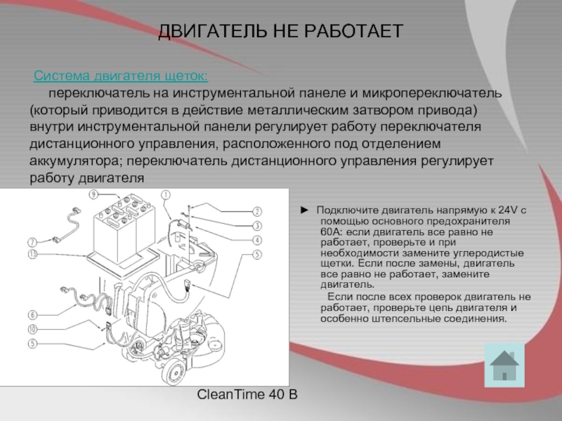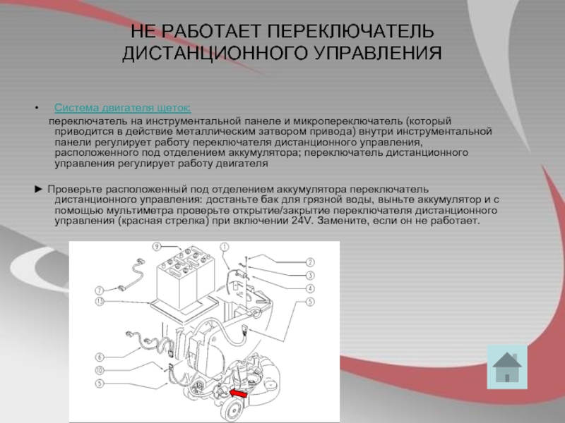 переключатель на инструментальной панеле и микропереключатель (который приводится в действие металлическим затвором привода) внутри инструментальной панели регулирует работу переключателя дистанционного управления, расположенного под отделением аккумулятора; переключатель дистанционного управления регулирует работу двигателя
