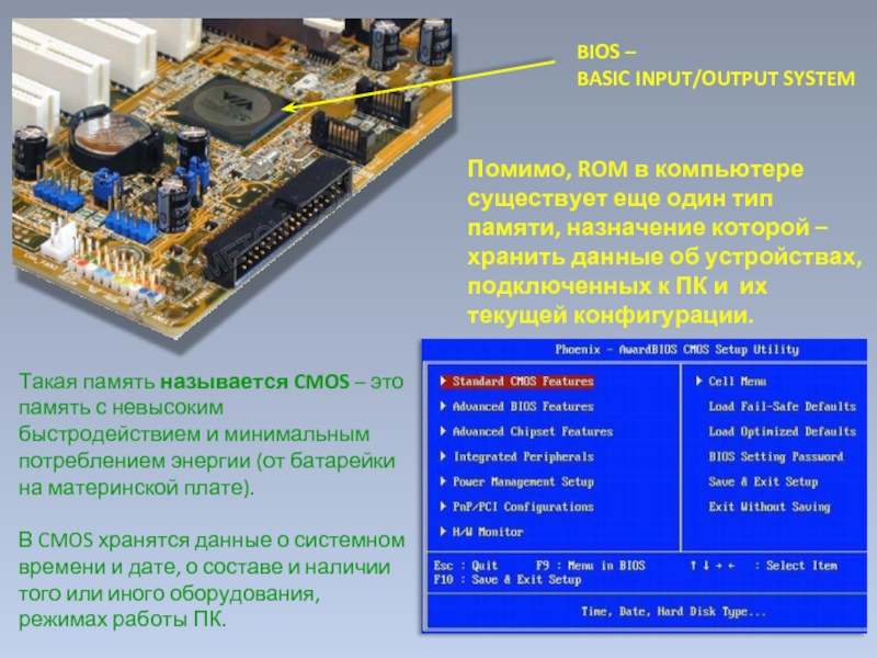 В CMOS хранятся данные о системном времени и дате, о составе и наличии того или иного оборудования, режимах работы ПК.