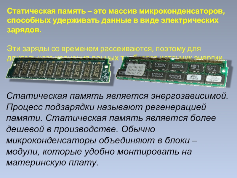 Статическая память является энергозависимой. Процесс подзарядки называют регенерацией памяти. Статическая память является более дешевой в производстве. Обычно микроконденсаторы объединяют в блоки – модули, которые удобно монтировать на материнскую плату.