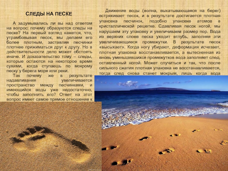 А задумывались ли вы над ответом на вопрос: почему образуются следы на песке? На первый взгляд кажется, что, утрамбовывая песок, мы делаем его более плотным, заставляя песчинки плотнее прижиматься друг к другу. Но в действительности дело может обстоять иначе. И доказательство тому – следы, которые остаются на некоторое время сухими, когда ступаешь по мокрому песку у берега моря или реки.
