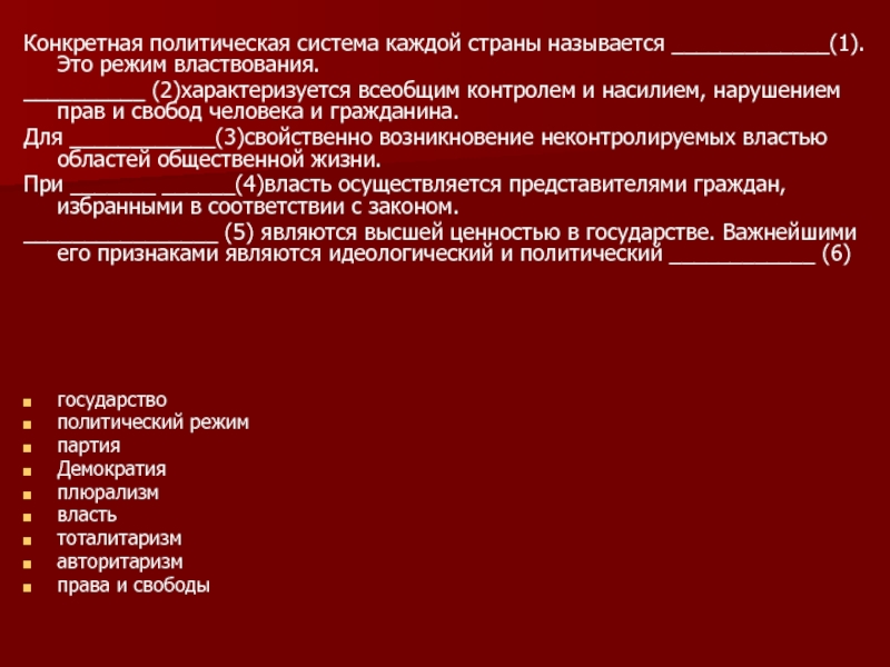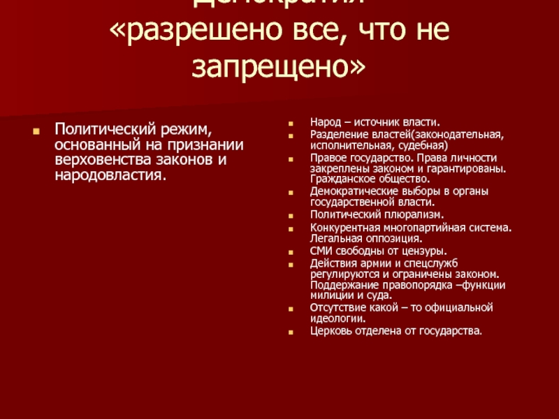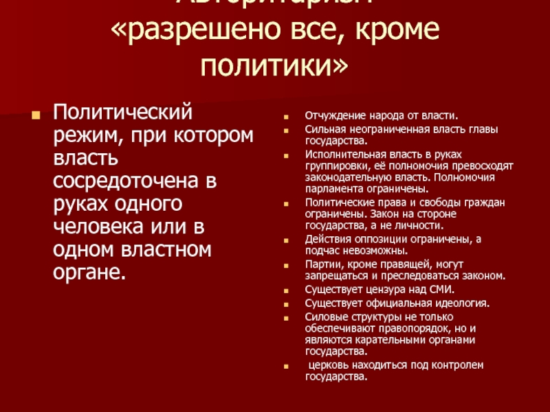 Политические права и свободы граждан ограничены. Закон на стороне государства, а не личности.