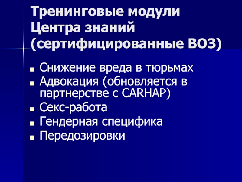 Слайд 10Тренинговые модули Центра знаний (сертифицированные ВОЗ)
