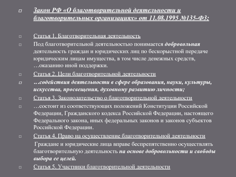 и благотворительных организациях» от 11.08.1995 №135-Ф3;