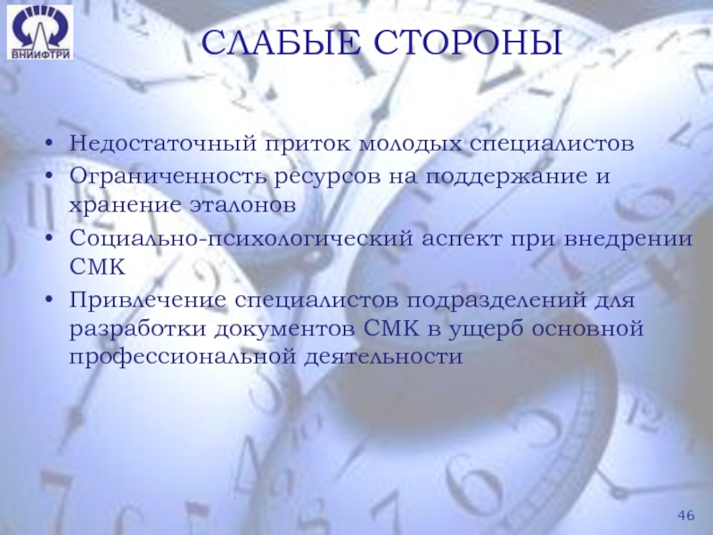 Слайд 43СИЛЬНЫЕ И СЛАБЫЕ СТОРОНЫ СМК ВНИИФТРИ