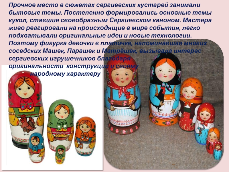 основные темы кукол, ставшие своеобразным Сергиевском каноном. Мастера живо реагировали на происходящие в мире события, легко подхватывали оригинальные идеи и новые технологии. Поэтому фигурка девочки в платочке, напоминавшая многих соседских Машек, Парашек и Матрёшек, вызывала интерес сергиевских игрушечников благодаря