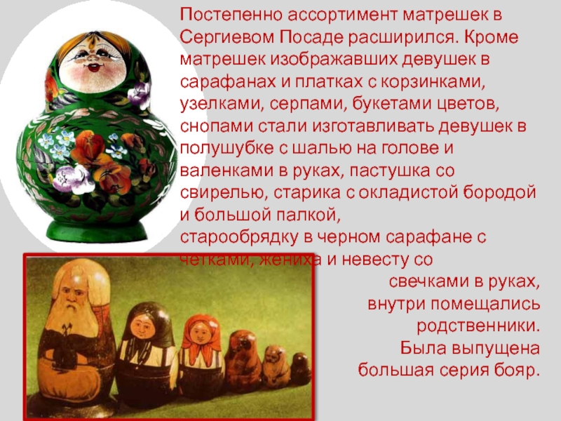 Слайд 16Постепенно ассортимент матрешек в Сергиевом Посаде расширился. Кроме матрешек изображавших девушек