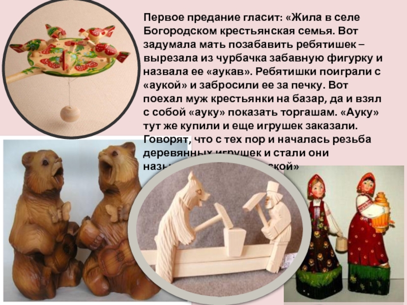 мать позабавить ребятишек – вырезала из чурбачка забавную фигурку и назвала ее «аукав». Ребятишки поиграли с «аукой» и забросили ее за печку. Вот поехал муж крестьянки на базар, да и взял с собой «ауку» показать торгашам. «Ауку» тут же купили и еще игрушек заказали. Говорят, что с тех пор и началась резьба деревянных игрушек и стали они называться «богородской»