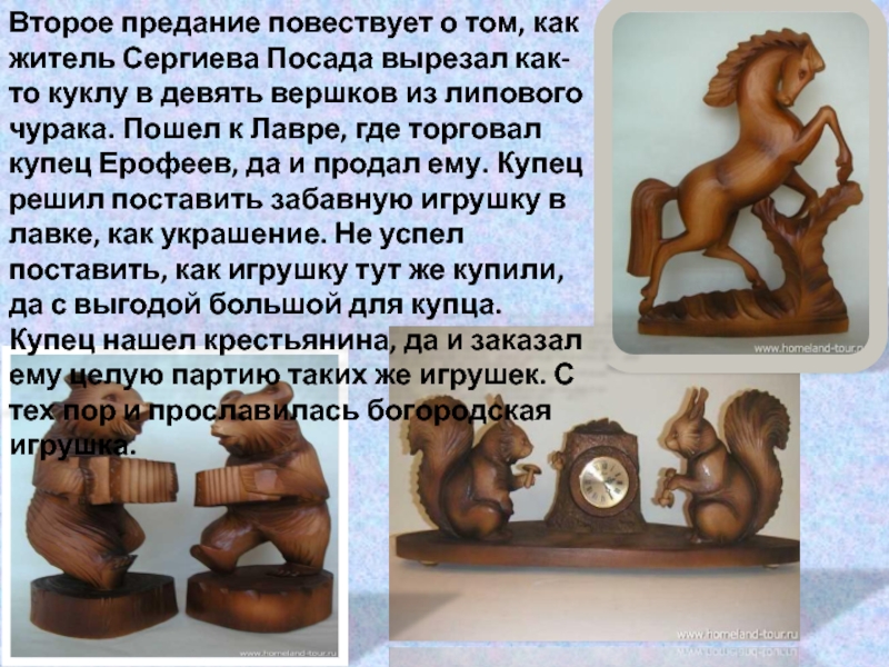 куклу в девять вершков из липового чурака. Пошел к Лавре, где торговал купец Ерофеев, да и продал ему. Купец решил поставить забавную игрушку в лавке, как украшение. Не успел поставить, как игрушку тут же купили, да с выгодой большой для купца. Купец нашел крестьянина, да и заказал ему целую партию таких же игрушек. С тех пор и прославилась богородская игрушка.