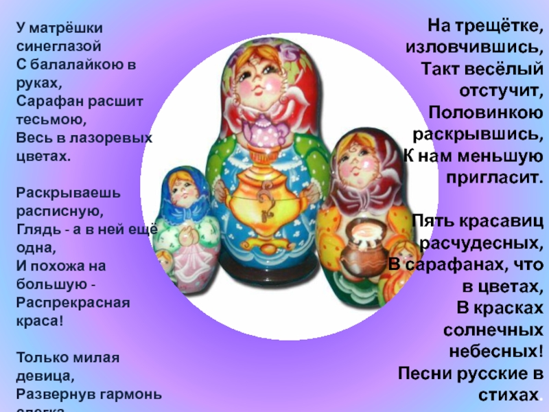 Слайд 21У матрёшки синеглазой