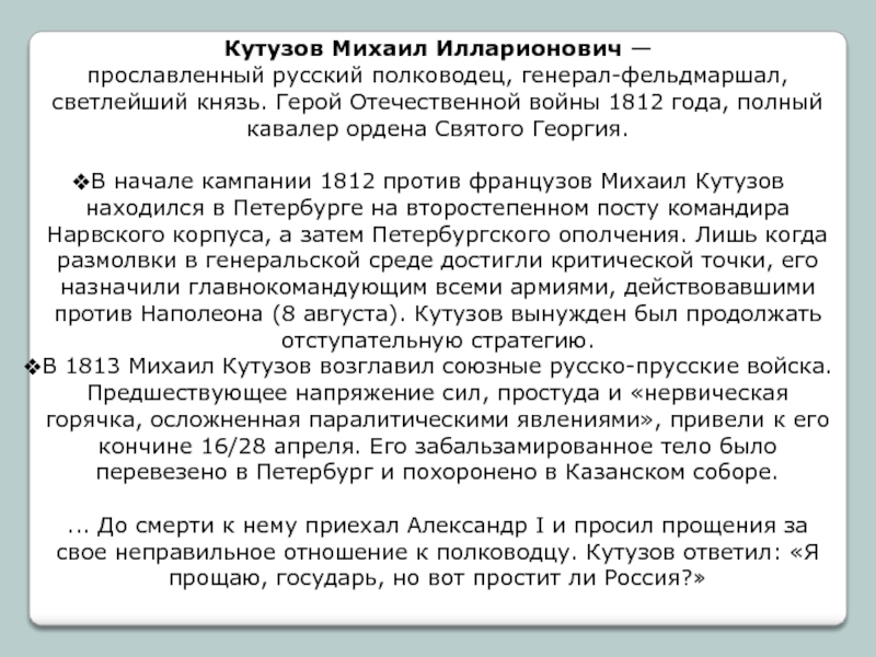 ... До смерти к нему приехал Александр I и просил прощения за свое неправильное отношение к полководцу. Кутузов ответил: «Я прощаю, государь, но вот простит ли Россия?»