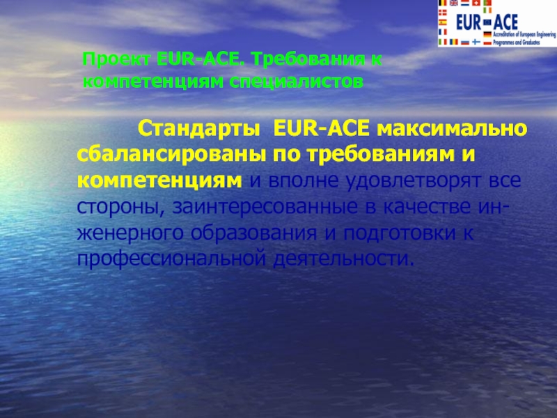 отсутствуют согласованные и общепринятые международные критерии оценки качества инженерных программ. В рамках проекта EUR-ACE ( EURopean ACcredited Engineer ), финансируе-мого Европейской Комиссией, профессиональными организациями ряда стран ( Великобритания, Ир-ландия, Германия, Франция, Италия, Португалия, Румыния и Россия ) под руководством FEANI и при участии SEFI, CESAER в 2004-05 гг. были разра-ботаны « EUR-ACE Стандарты и Процедуры Аккредитации Инженерных Программ ».