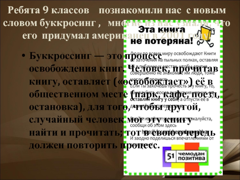 Буккроссинг — это процесс освобождения книг. Человек, прочитав книгу, оставляет («освобождает») её в общественном месте (парк, кафе, поезд, остановка), для того, чтобы другой, случайный человек мог эту книгу найти и прочитать; тот в свою очередь должен повторить процесс.