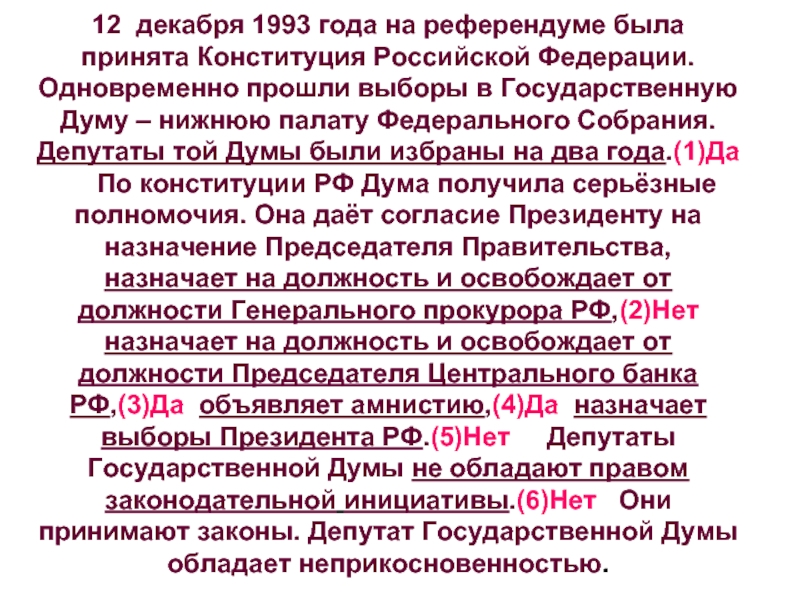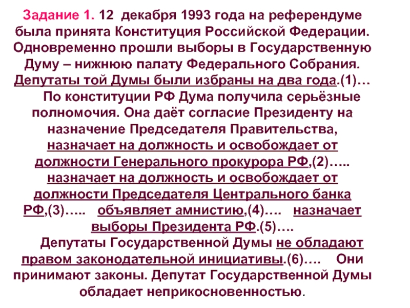 По конституции РФ Дума получила серьёзные полномочия. Она даёт согласие Президенту на назначение Председателя Правительства, назначает на должность и освобождает от должности Генерального прокурора РФ,(2)….. назначает на должность и освобождает от должности Председателя Центрального банка РФ,(3)….. объявляет амнистию,(4)…. назначает выборы Президента РФ.(5)….