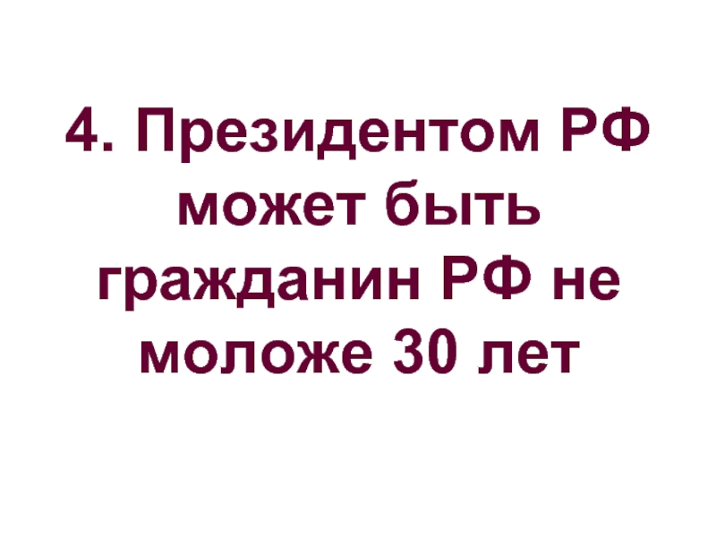 Слайд 284. Президентом РФ может быть гражданин РФ не моложе 30 лет