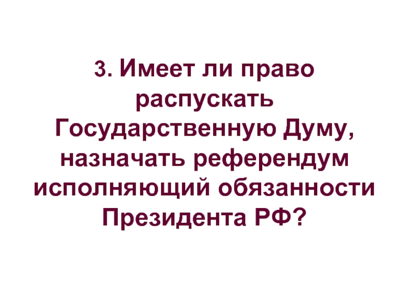 Слайд 823. Имеет ли право распускать Государственную Думу, назначать референдум исполняющий обязанности