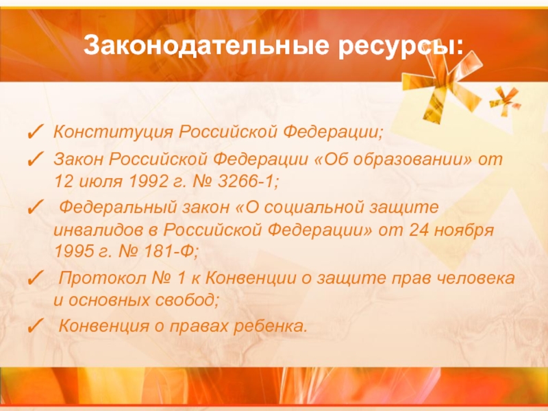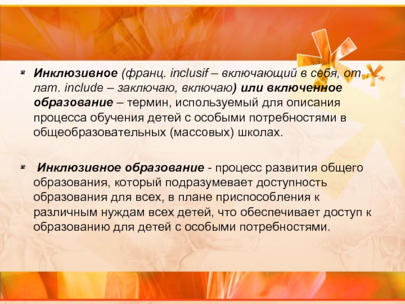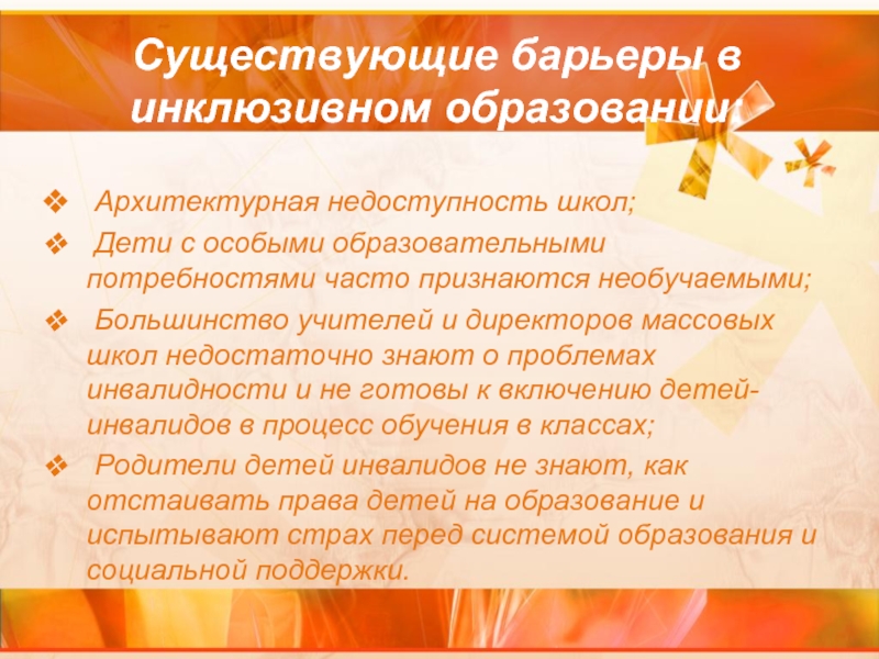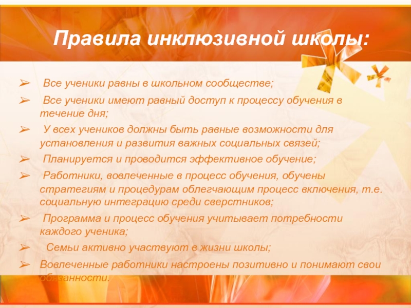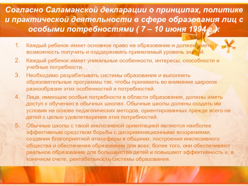 Лица, имеющие особые потребности в области образования, должны иметь доступ к обучению в обычных школах. Обычные школы должны создать им условия на основе педагогических методов, ориентированных прежде всего на детей с целью удовлетворения этих потребностей.