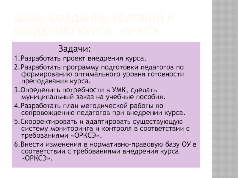 6.Внести изменения в нормативно-правовую базу ОУ в соответствии с требованиями внедрения курса «ОРКСЭ».